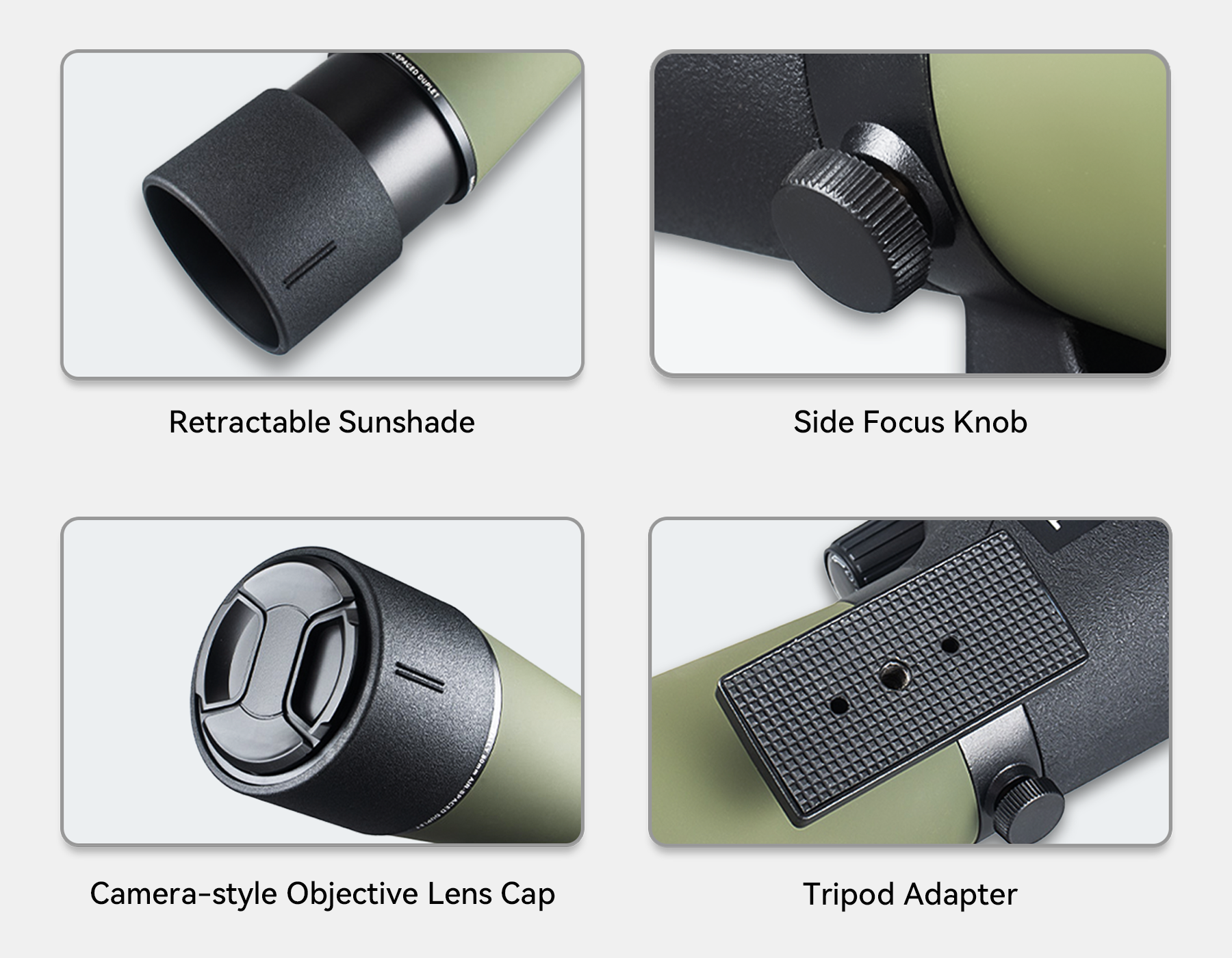 The 80mm objective lens ensures superior light gathering for an extremely bright and clear image. Capture the rich details of feathers even at dawn or dusk. Professional aperture for an unmatched ultra-clear view.
